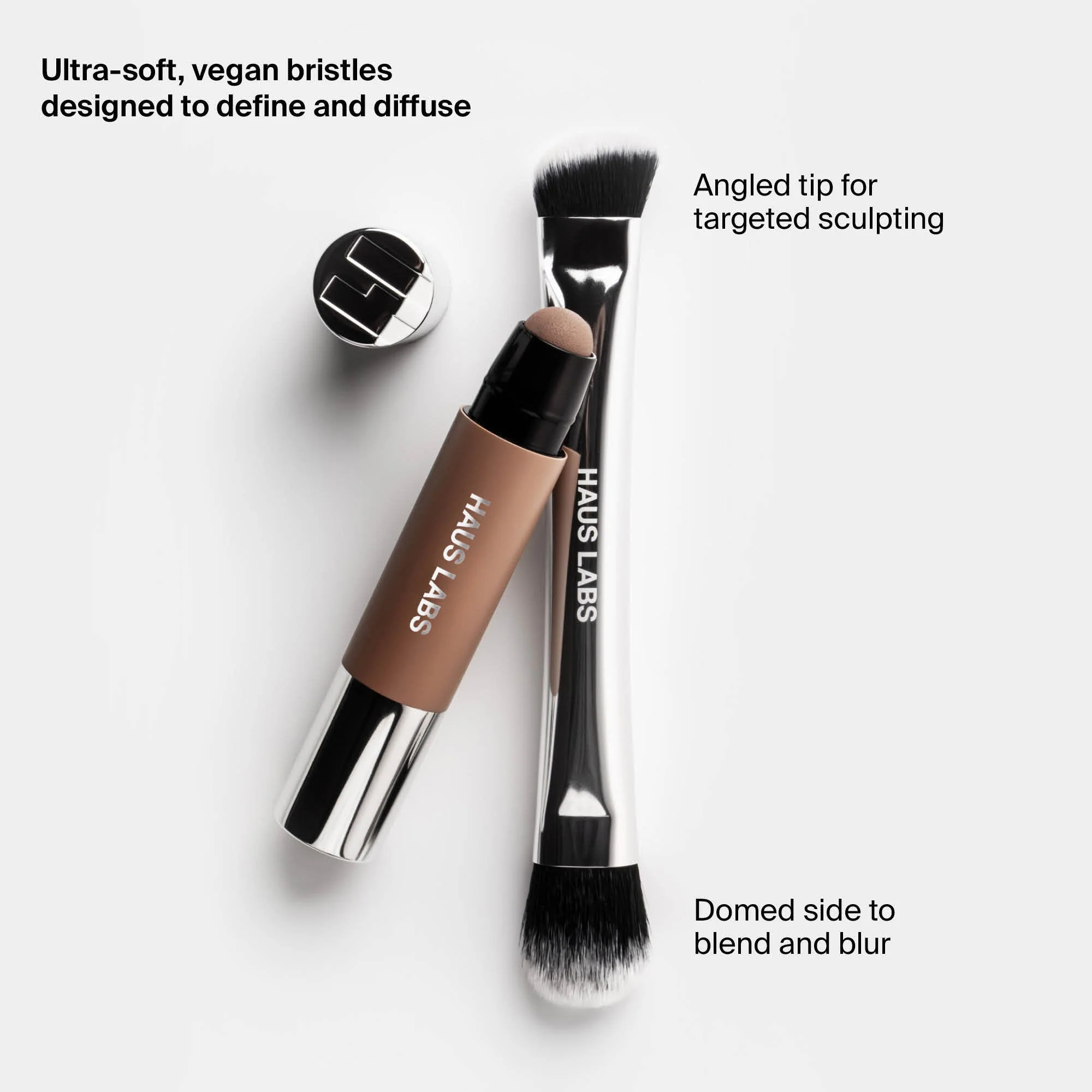 A dual-ended brush with ultra-soft, vegan bristles designed to enhance, define and diffuse cream or powder formulas into the hollows of the face.
